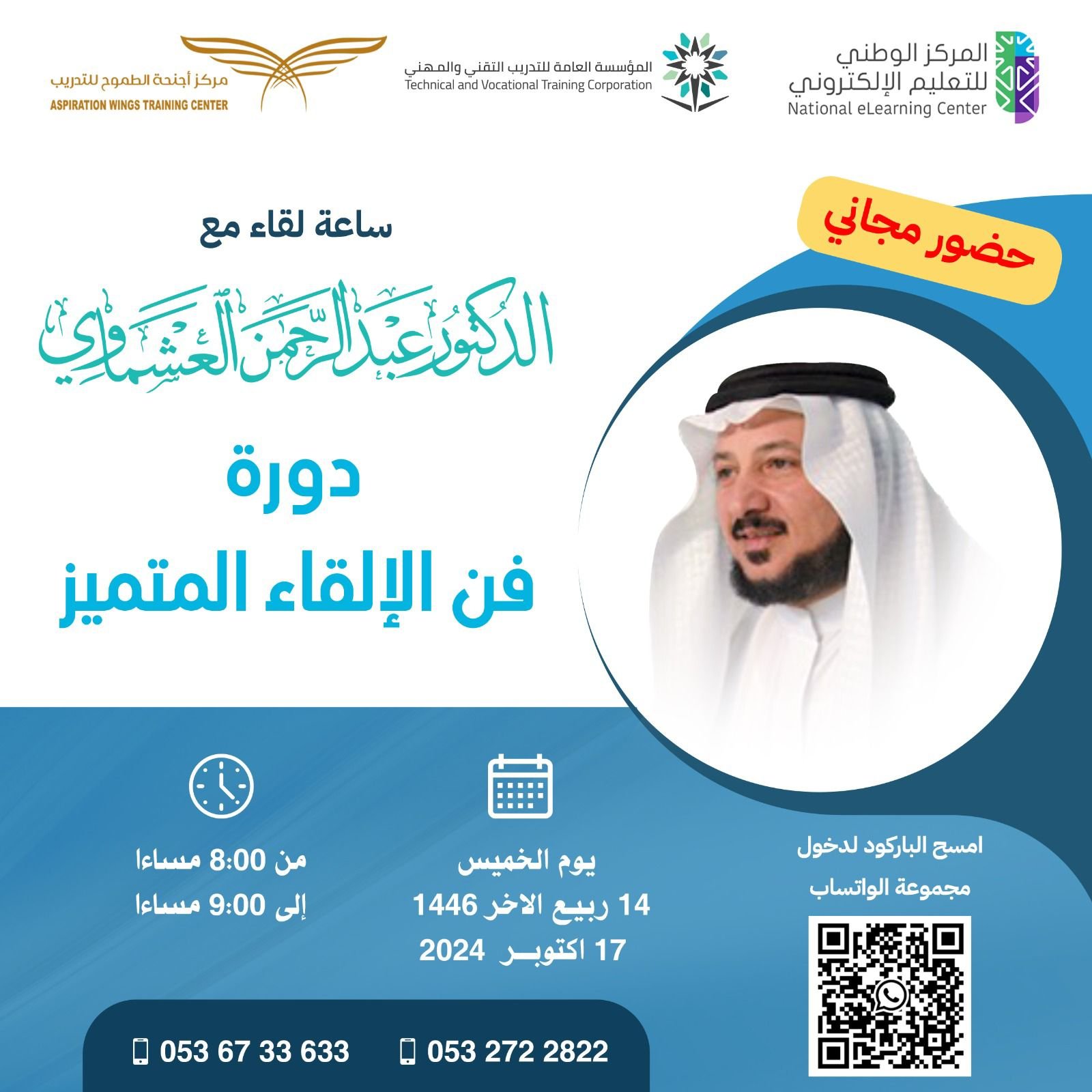 نفذ مركز أجنحة الطموح للتدريب بالتعاون مع المؤسسة العامة للتدريب التقني والمهني و المركز الوطني للتعليم الإلكتروني، يوم الخميس 17 أكتوبر 2024م، دورة تدريبية بعنوان: فن الإلقاء المتميز، قدمها الدكتور عبدالرحمن العشماوي.