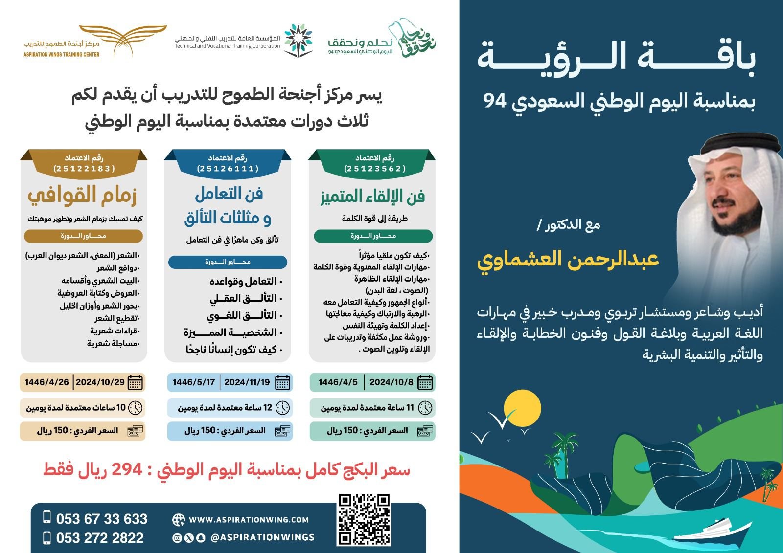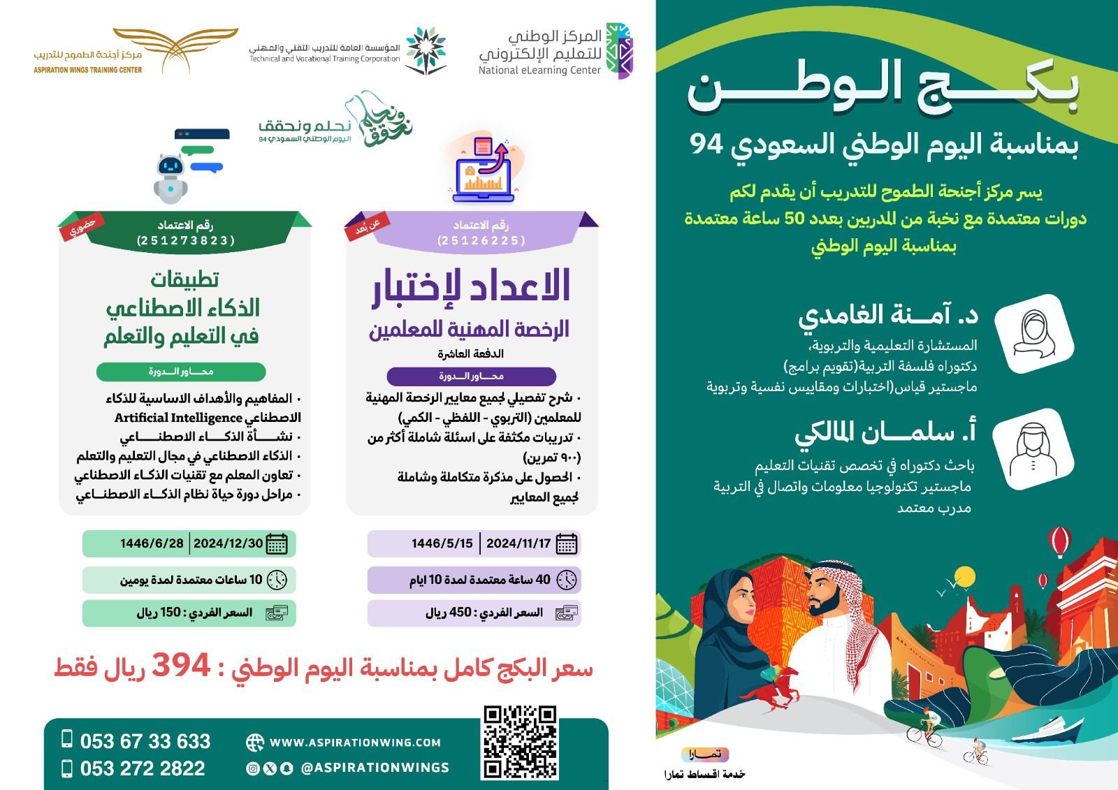 بمناسبة اليوم الوطني السعودي الـ94، أطلق مركز أجنحة الطموح للتدريب باقة خاصة تضم 3 دورات تدريبية معتمدة، بإجمالي أكثر من 60 ساعة تدريبية، وبسعر رمزي يبدأ من 494 ريال فقط.الدورات شملت:
