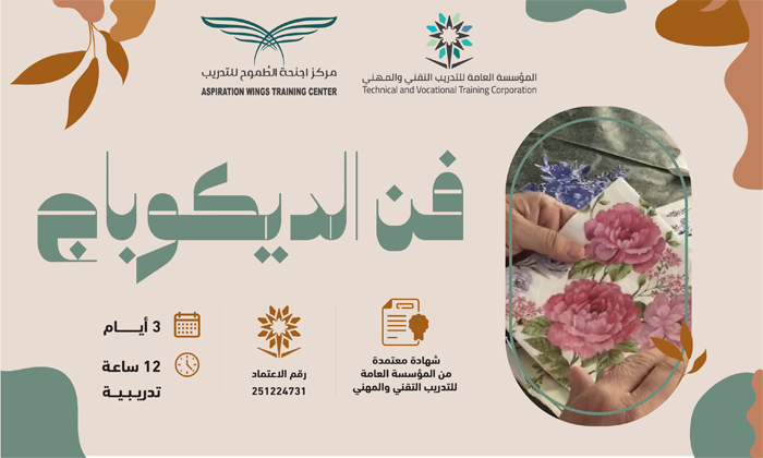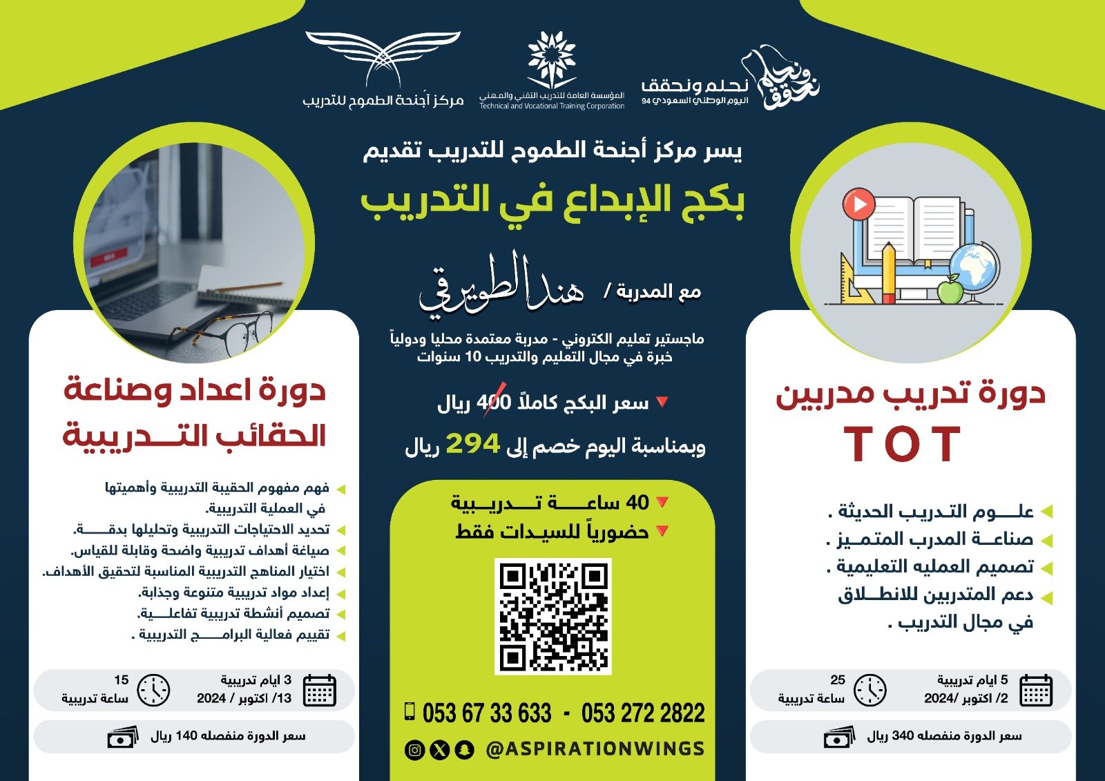 يسر مركز أجنحة الطموح للتدريب أن يعلن عن انطلاق بكج الإبداع التدريبي، والذي تقدمه الأستاذة هند الطويرقي، حضوريًا في مقر المركز بمكة المكرمة، ومخصص للسيدات فقط.يحتوي البكج على دورتين معتمدتين بواقع 40