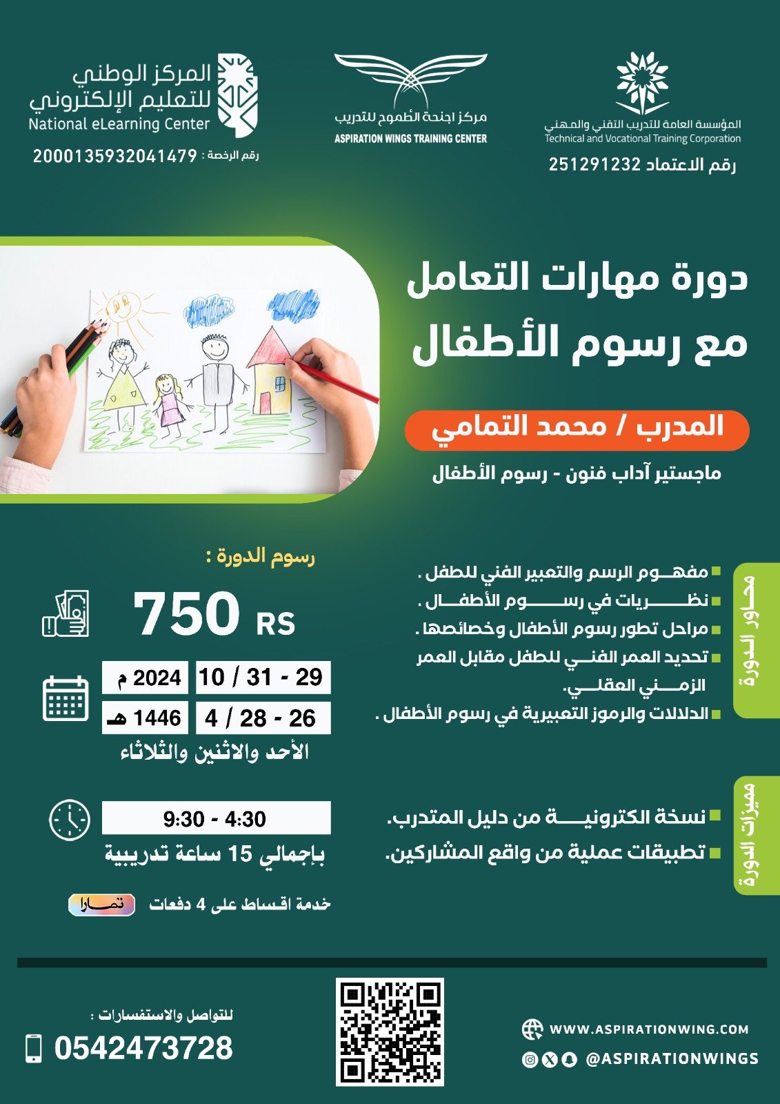 أقام مركز أجنحة الطموح للتدريب دورة تدريبية بعنوان تحليل رسوم الأطفال، قدمها الأستاذ محمد التمامي، عبر الإنترنت ولمدة 3 أيام متتالية.وهدفت الدورة إلى تزويد المشاركين بالمهارات وال