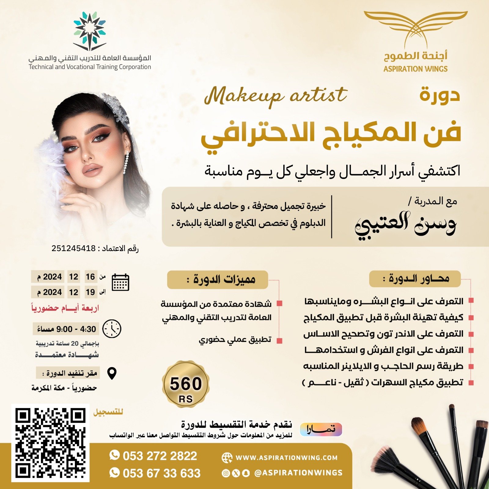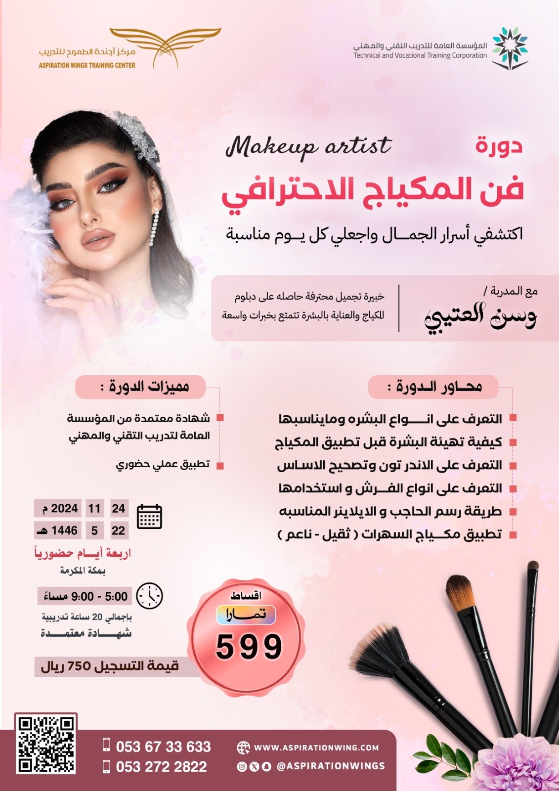أقام مركز أجنحة الطموح للتدريب دورة تدريبية بعنوان فن المكياج الاحترافي، قدمتها المدربة وسن العتيبي، حضوريًا في مقر المركز بمكة المكرمة.وهدفت الدورة إلى تدريب المشاركات على أحدث أس