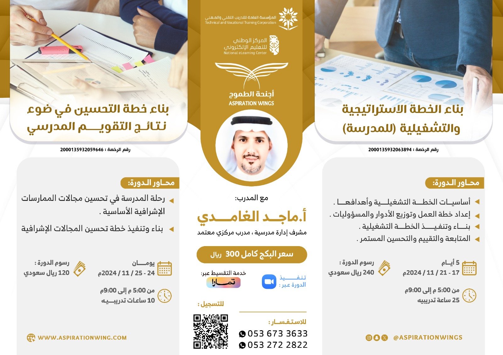 اختتم مركز أجنحة الطموح للتدريب بنجاح باقة تدريبية استمرت سبع أيام، قدمها الأستاذ ماجد الغامدي، وشملت دورتين متخصصتين 1. بناء الخطة الاستراتيجية والتشغيلي