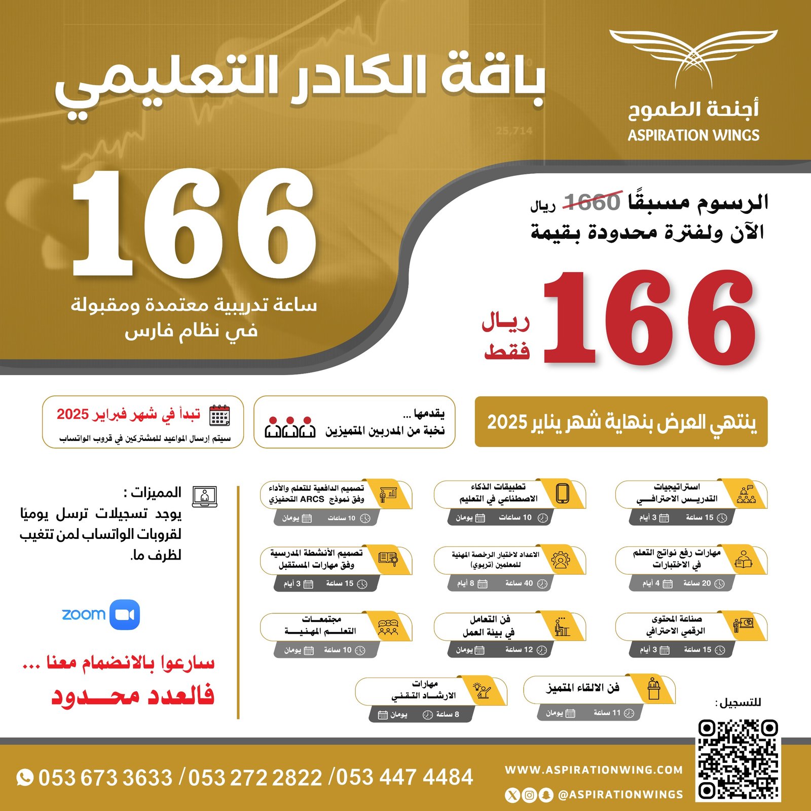 قدم مركز أجنحة الطموح للتدريب باقة الكادر التعليمي، والتي شملت 11 دورة تدريبية بسعر رمزي، بمناسبة بداية السنة الميلادية 2025.قدمت الدورات مجموعة نخبة من المدربين المتخصصين، واستفاد منها الكا