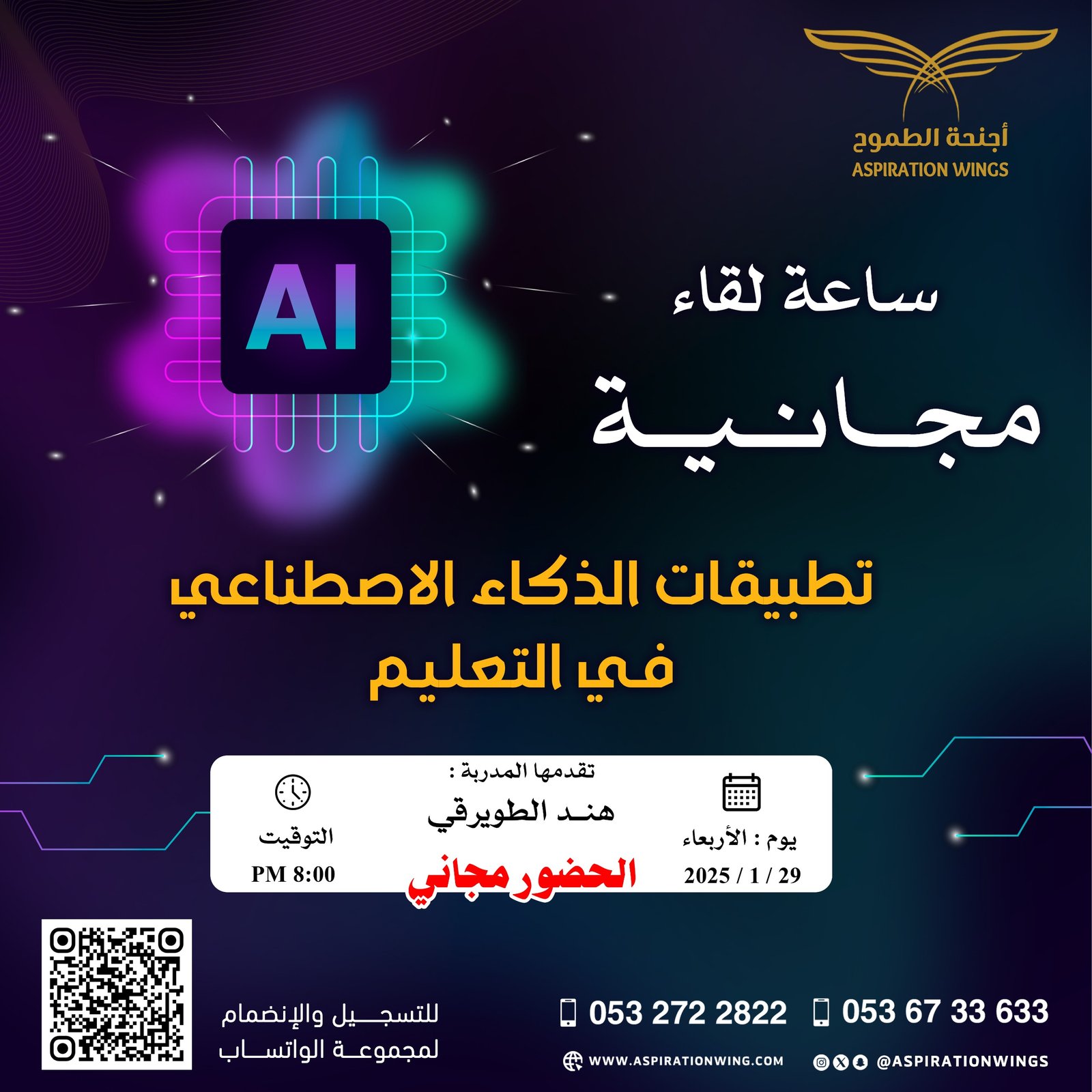 قدم مركز أجنحة الطموح للتدريب ساعة لقاء مجاني مع الأستاذة هند الطويرقي، حيث تناولت خلالها تطبيقات الذكاء الاصطناعي في التعليم، واستعرضت أحدث الأساليب والأدوات التي يمكن للمعلمين والكادر التعليمي الاست